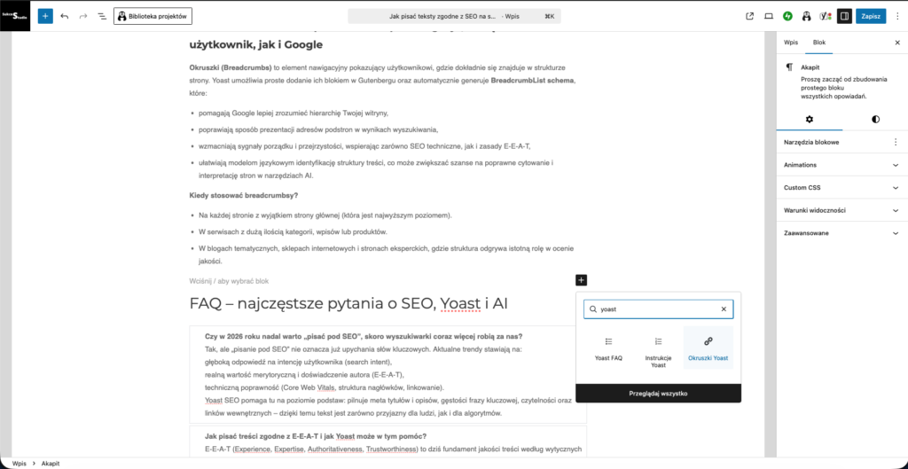 1. Blok Yoast FAQ – idealny do budowania widoczności w SEO i AI